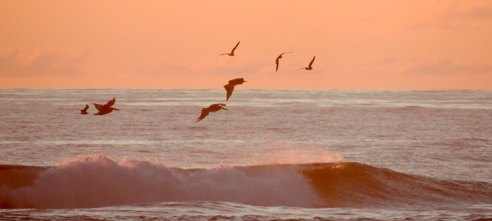 Pelicans and gulls over the Pacific at sunset