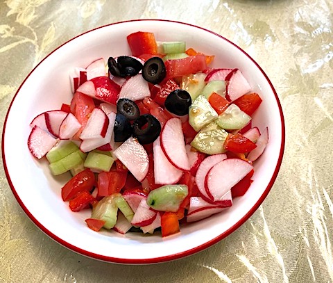 1/2 red bell pepper, 1 green pepper, 8 radishes, and a can of sliced black olives.
